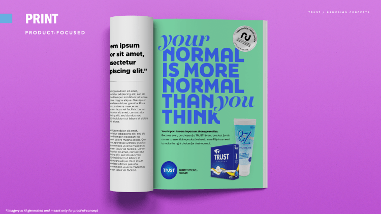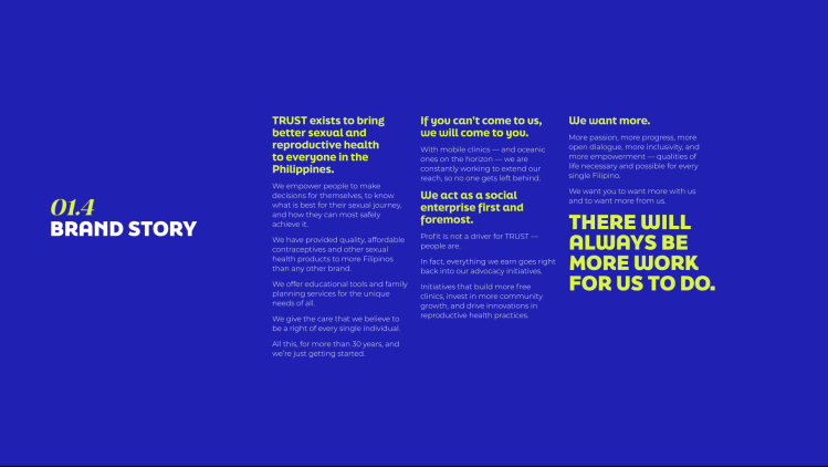 TRUST is the largest contraceptive brand in the Philippines, and I was lucky enough to work on their ground-up brand revitalization (the first one in 30 years), including: new brand identity conceptualization, brand book, and relaunch campaign.